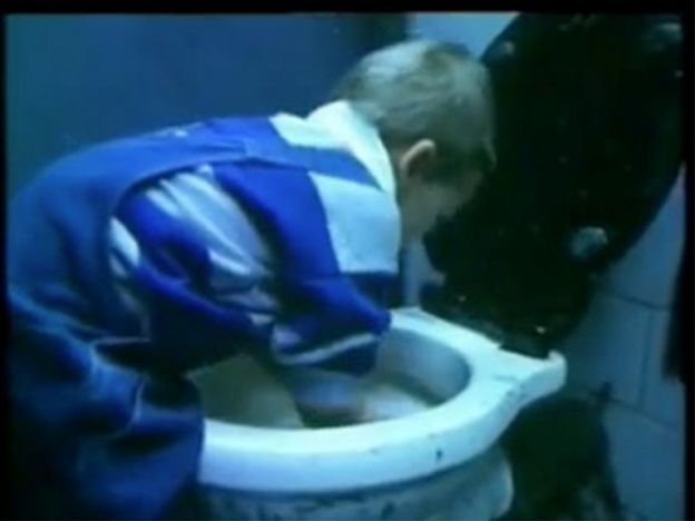 He goes into a cubicle. Kneels down. And starts drinking water out of a toilet bowl.